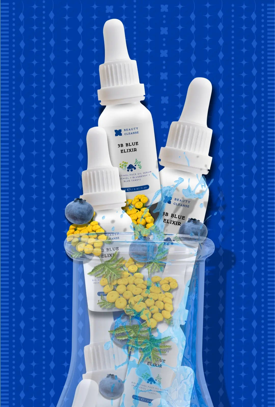 Dive into our 3B Bio-Retinol Blue Elixir, featuring 1% Bakuchiol, a plant-based retinol alternative, alongside calming blue tansy flower and blueberry extract, which serves as a pro-retinol source (Vitamin A), fortifying skin against blue light exposure.